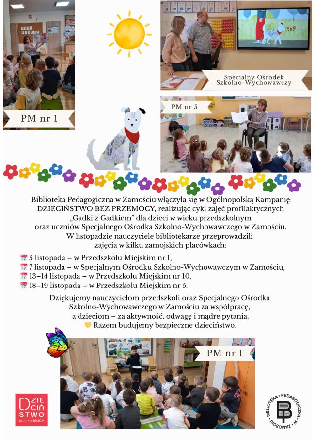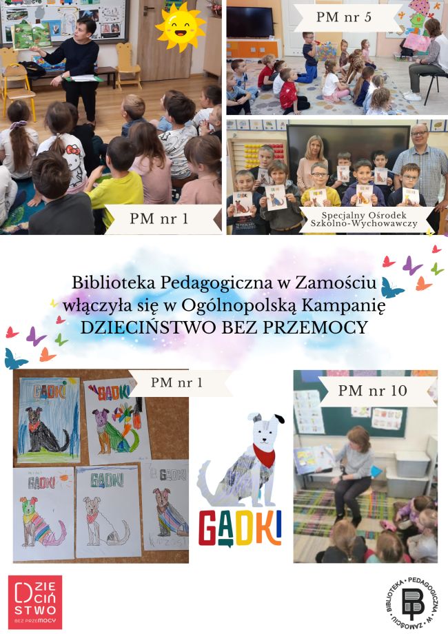 Biblioteka Pedagogiczna w Zamościu włączyła się w Ogólnopolską Kampanię „Dzieciństwo bez przemocy”, realizując cykl zajęć profilaktycznych „Gadki z Gadkiem” dla dzieci w wieku przedszkolnym oraz uczniów Specjalnego Ośrodka Szkolno-Wychowawczego w Zamościu.