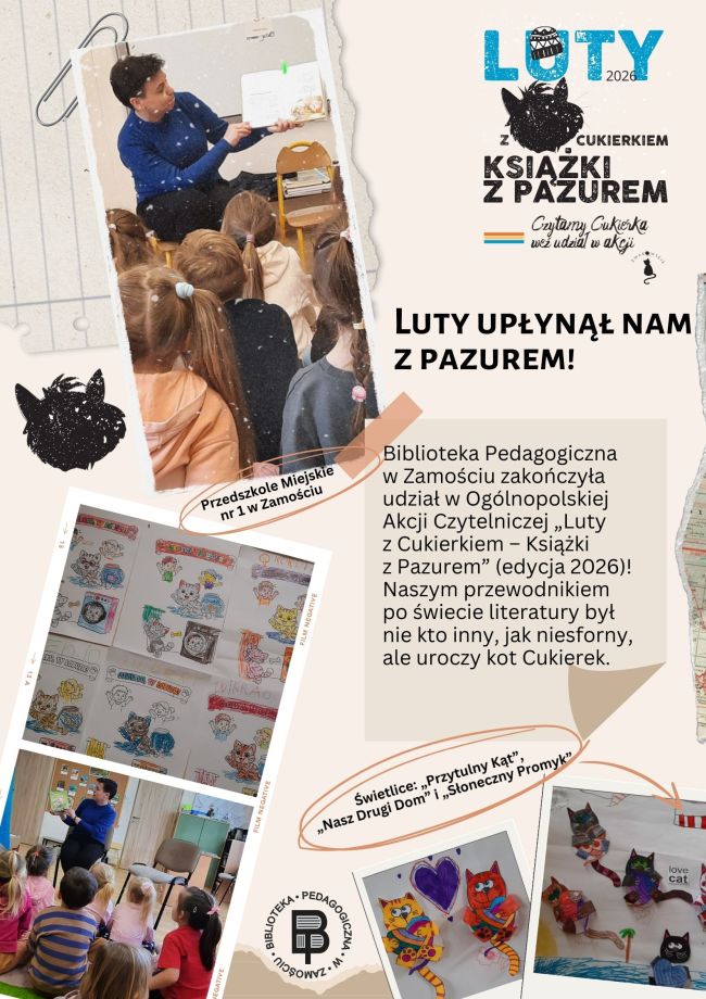 Biblioteka Pedagogiczna w Zamościu zakończyła udział w Ogólnopolskiej Akcji Czytelniczej „Luty z Cukierkiem – Książki z Pazurem” (edycja 2026)! Naszym przewodnikiem po świecie literatury był nie kto inny, jak niesforny, ale uroczy kot Cukierek.